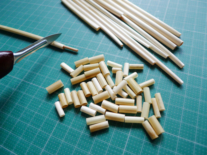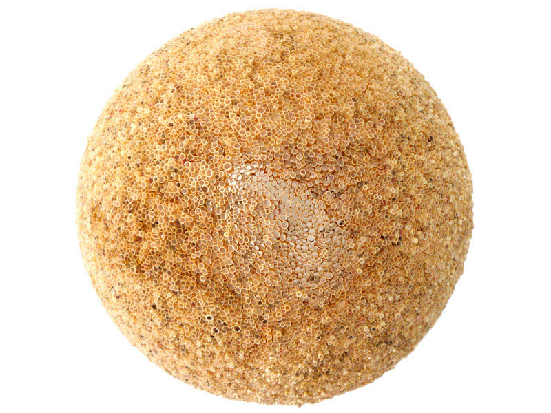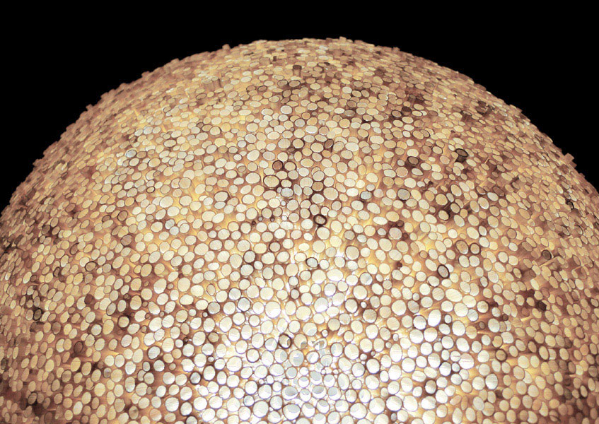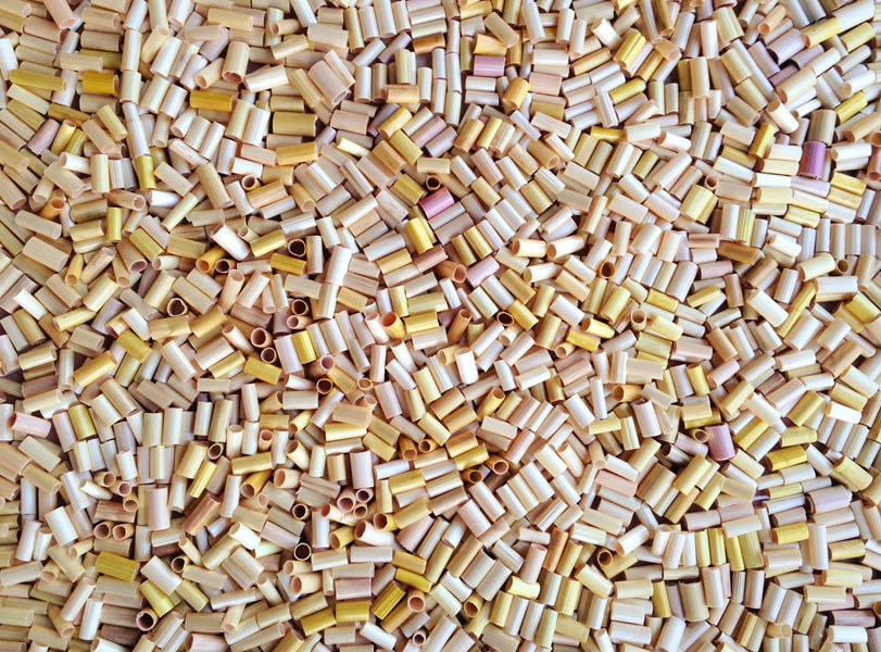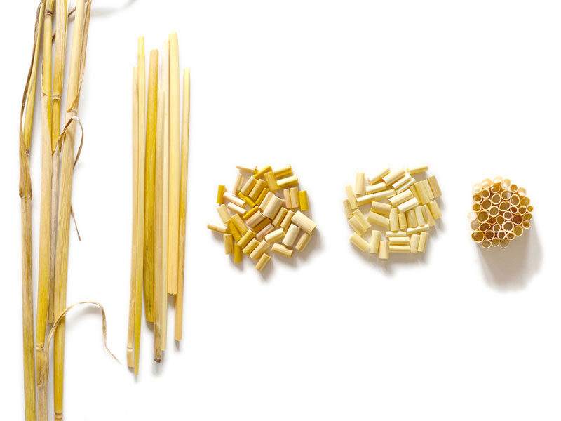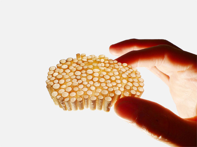 AUDE GENTON DESIGN PROJECTS EYELET Ruche Thousands of small pieces of straw are glued together on a mould forming a half sphere. This translucent honeycomb structure is then detached from the mould and mounted as a lampshade. The natural variations in size and colour of the stalks creates a vibrant pattern. The light through the straw gives a warm ambiance with golden reflections. Ruche (beehive in French) was awarded second prize in the design competition Prix Paille organized by the Strohmuseum in Wohlen, Switzerland. materials: oat straw, steel frame, compact fluorescent lamp size: Ø 45 cm design: 2014 |